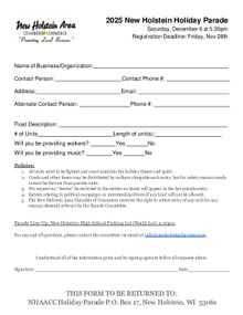 The New Holstein Area Chamber of Commerce will be hosting the 3rd annual New Holstein Holiday Parade on Saturday, December 6, 2025. Along with the community and Santa, the Twinkling of the Lights in Kiwanis Park. The parade will end in Kiwanis Park by the New Holstein Community Center and Santa will be lighting up Kiwanis Park.  Parade route is listed below.